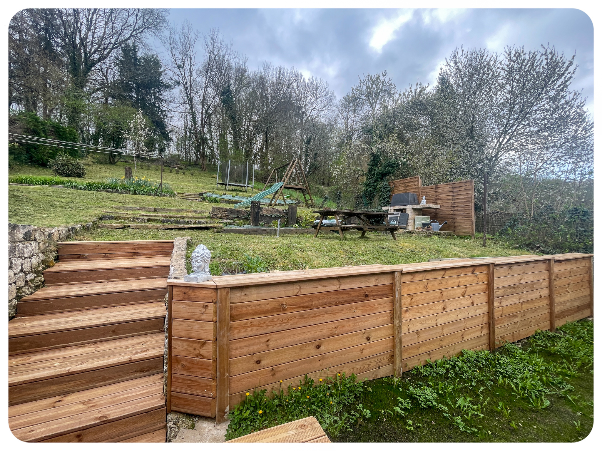 À l’extérieur, un jardin en pente vous invite à profiter des belles journées pour jardiner ou simplement vous détendre.