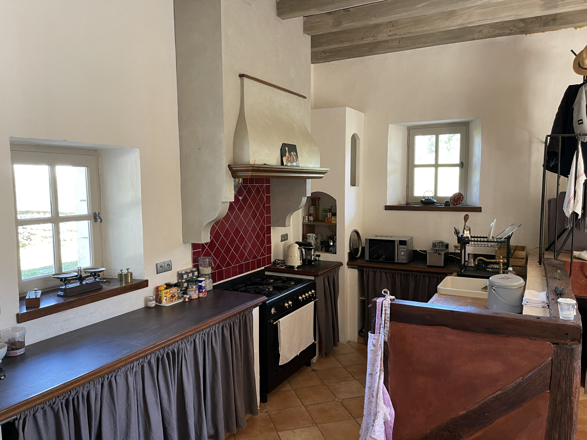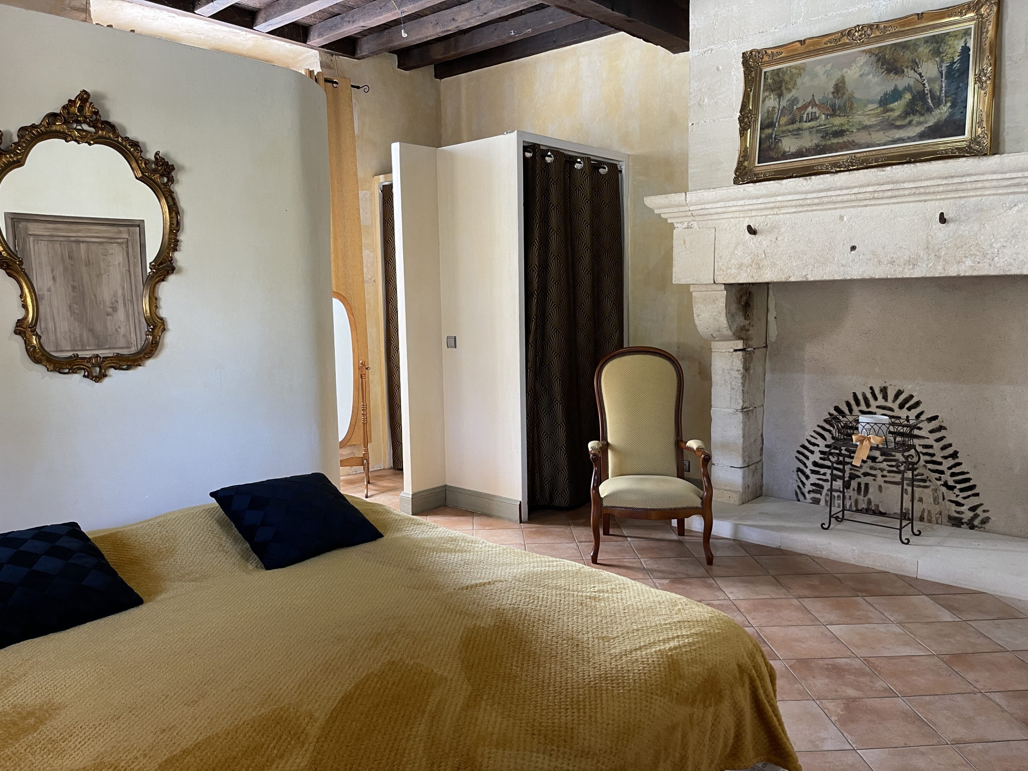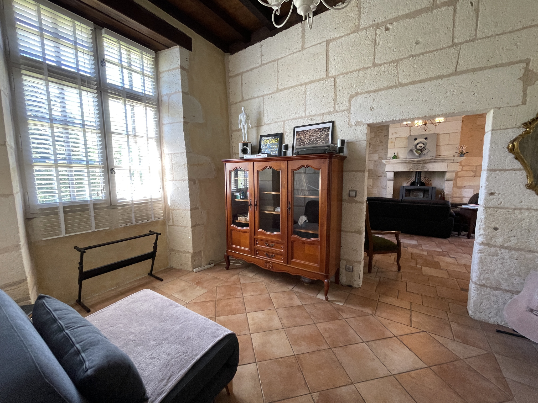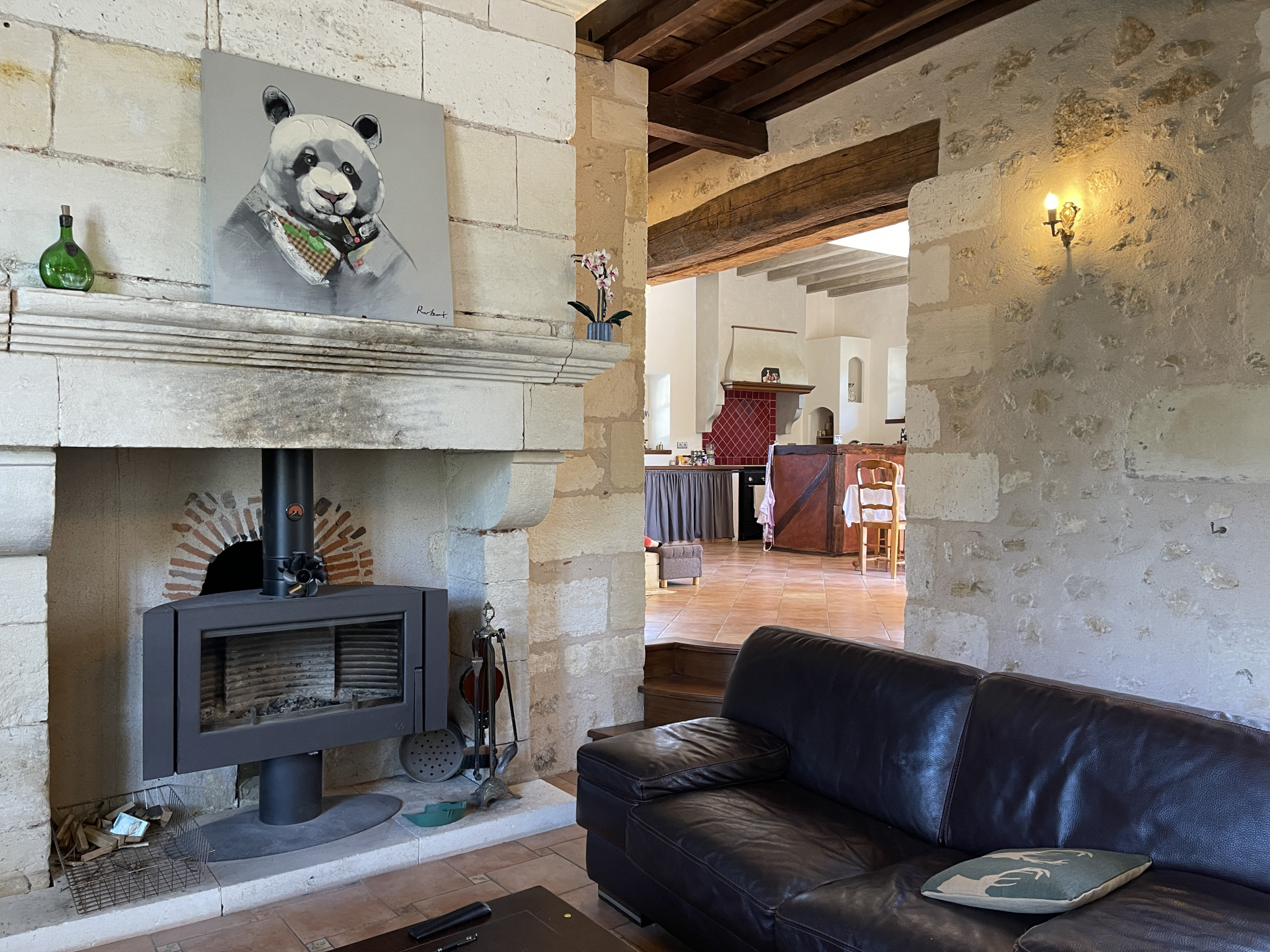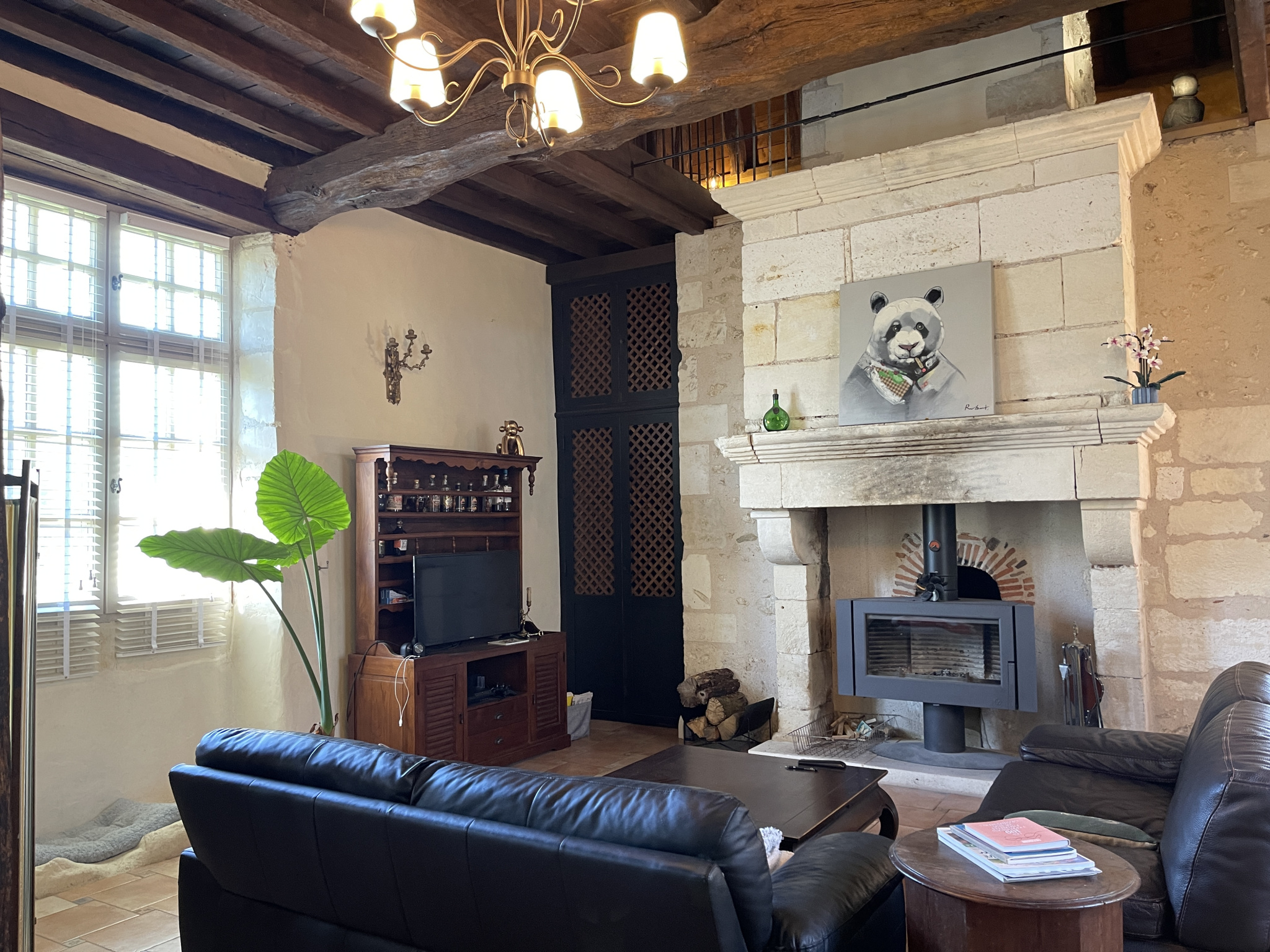 – Un salon traversant baigné de lumière, sublimé par un poêle au coeur d’une ancienne cheminée en pierres
