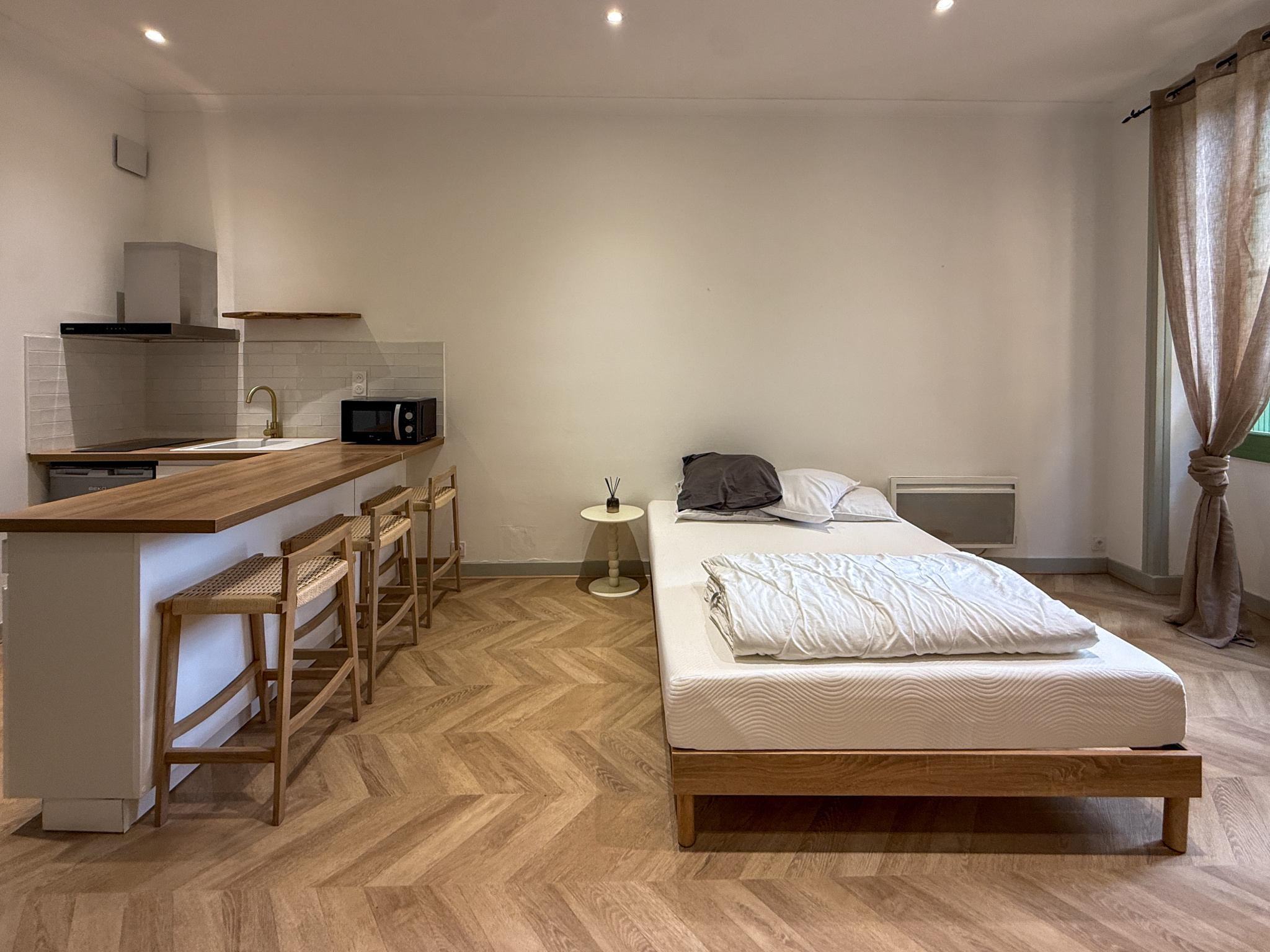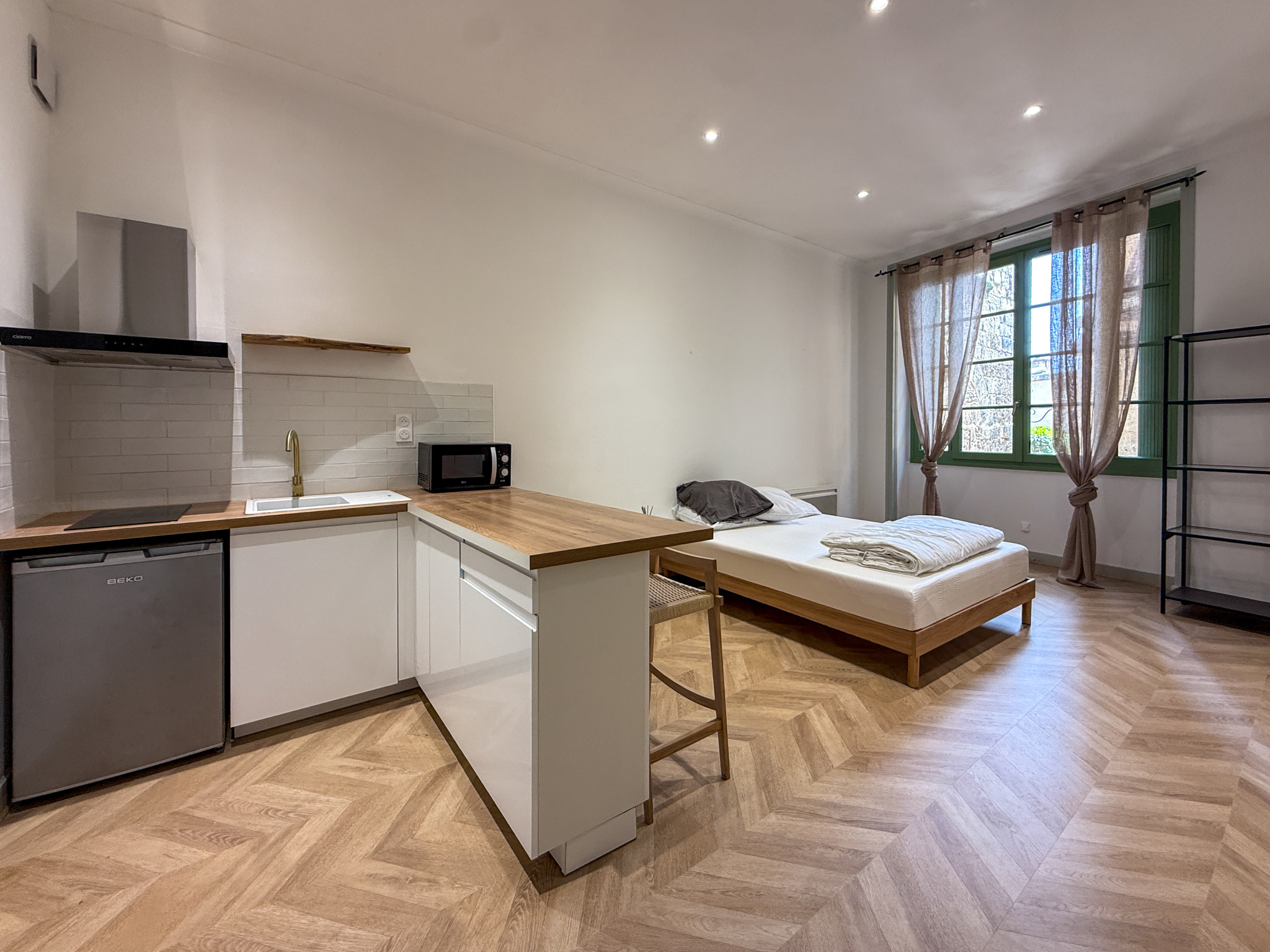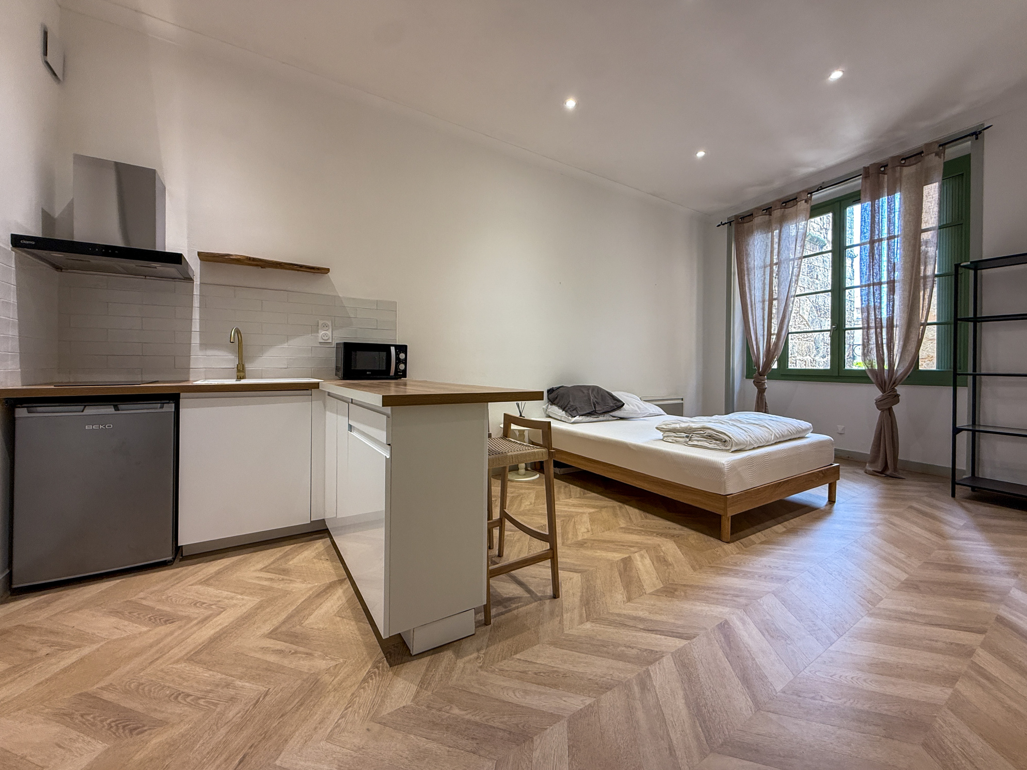 Charmant studio de plain-pied au coeur du centre historique de Périgueux Idéalement situé en plein centre historique de Périgueux, à deux pas de tous les commerces et commodités, ce studio de caractère vous séduira par son emplacement privilégié et son authenticité. Au sein d’un petit immeuble en pierre, dans une copropriété à taille humaine, ce bien bénéficie d’une belle hauteur sous plafond et d’un cachet indéniable. D’une surface optimisée, il se compose : od’une agréable pièce de vie d’environ 27 m2 avec cuisine aménagée et équipée, od’une salle d’eau avec WC d’environ 3 m2. Situé en rez-de-chaussée dans une rue calme et peu passante, ce studio offre un cadre de vie paisible. Sa configuration de plain-pied le rend particulièrement adapté aux personnes à mobilité réduite. Lumineux et agréable, il bénéficie également d’une vue dégagée, un véritable atout en centre-ville. Idéal pour un premier achat, un pied-à-terre ou un investissement locatif.